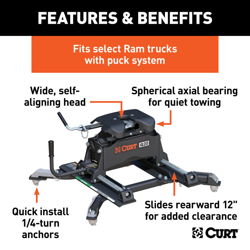 Like the other 5th wheel hitches of the CURT Q-series, the CURT Q20 is designed to offer the quietest 5th wheel towing possible. It does this using a spherical axial bearing. This unique pivoting mechanism is built into the hitch head and allows it to tilt with the 5th wheel trailer in any direction necessary. With its dual-locking jaws for 360-degree pin contact and three grease fittings for continuous lubrication, the spherical axial bearing provides smooth, safe, quiet towing, even with large 5th wheel trailers. The Q20 also makes the coupling process easier. It features a self-aligning head to help reduce errors when backing up to the kingpin, as well as a three-position coupling indicator that is visible from the truck cab, eliminating the need to get out of the vehicle to check the connection. This 20K 5th wheel hitch comes with the CURT R20 roller and the CURT OEM puck system 5th wheel roller adapter. It is designed to be mounted on a Ram short-bed pickup with the truck bed puck system. Using a set of quarter-turn anchors, the adapter quickly and easily drop into the pucks, instantly mounting the Q20 hitch and roller and equipping the truck for 5th wheel towing. Once installed, the R20 roller allows for added clearance when making tight turns with your trailer. CURT 5th wheel rollers are true rolling units, meaning they actually roll on wheels that bear the weight of the trailer rather than simply sliding on hollow rods as seen in competitive models. With a thick operating handle, the roller smoothly rolls the 5th wheel head forward and back, locking securely into each position as desired. CURT rollers also provide up to 12" of displacement as well, unlike the more common 10", to give you a wide range of motion and plenty of space to get your RV or other 5th wheel trailer around any turn. This Q20 hitch with puck system roller is only intended to fit the Ram puck system and cannot be installed without it.
